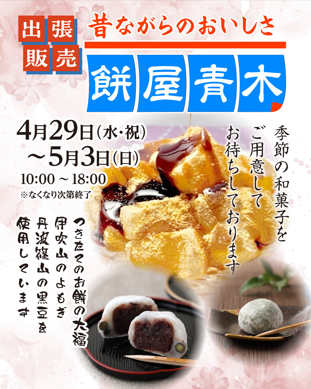 【催事】2026年4月29日(水・祝)~5月3日(日) 青木商店「和菓子出張販売」のおしらせ